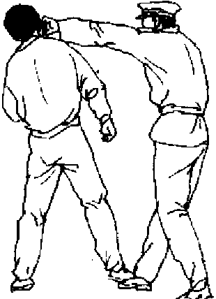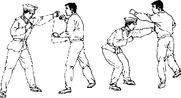 【动作要领】双方成格斗势(图69),我向前进步「同时 以左拳摆击敌右侧太阳穴(图70),敌如向后退步,我立即上 左步并以右拳勾击其中盘(图71K
