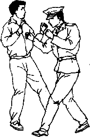 【动作说明】双方成格斗势(图性)。我向前进步,同时 用左直拳向敌面部击打(图73),接着,右脚跟上半步,屈膝稍 向右倾体,低头收颌,同时再用左直拳击打敌腹部(图74).