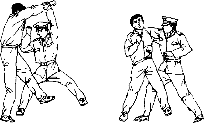 【动作说明】当敌以左拳虚晃,再突以右直拳向我头部 击来时,我速用左臂上架*并向后牵带,右腿同时上步,身体向 左拧转借身体下沉之势,用右肘砸击敌腹部(图268),接着再 用右肘向上挑击敌F颌部(图269).