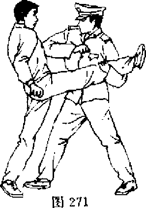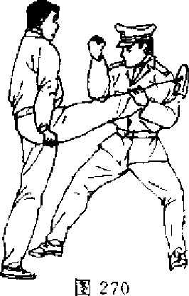 ,【动作说明】当敌左拳虚晃,突用右腿侧踹我胸腹时,我 速向左转体并用左手锁抱敌攻击腿,然后用右肘向下砸击敌 右大腿(图270),接着再用右肘顶击敌心窝处(图271),