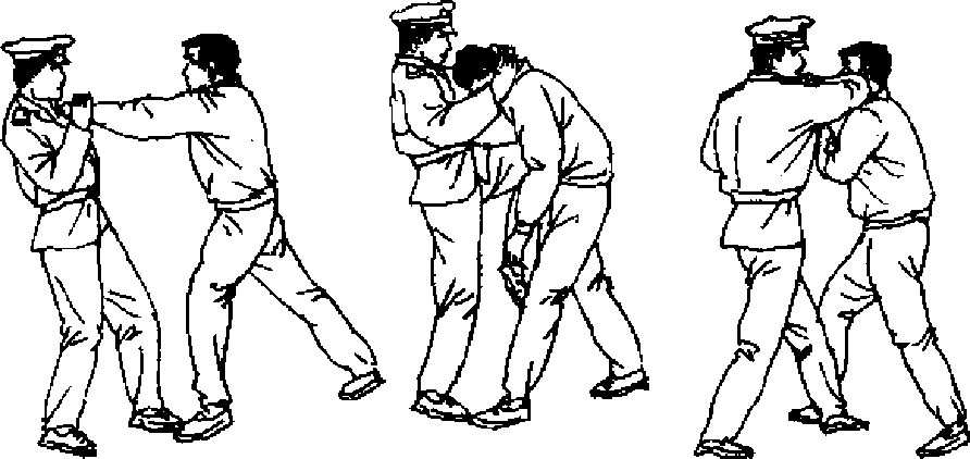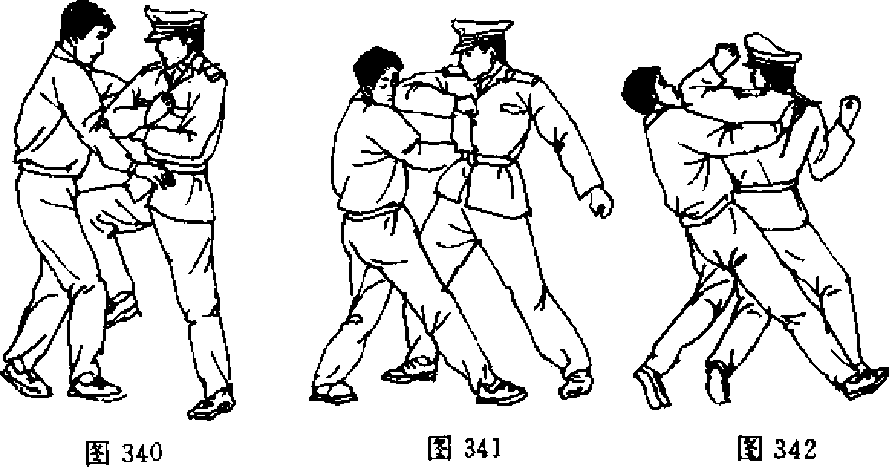 【动作说明】敌我对峙。敌突然疾步向前*欲用双手抱我 腰部,我速用双手向两侧分格,同时提右膝猛顶敌裆部(图 340),当敌受击后退时,我趁机右脚向前落步,重心前移,同时 用右肘向前扫击敌头部(图341).接着,我身体左后转,左脚 随之后收,顺势用左肘扫击敌头部(图342"