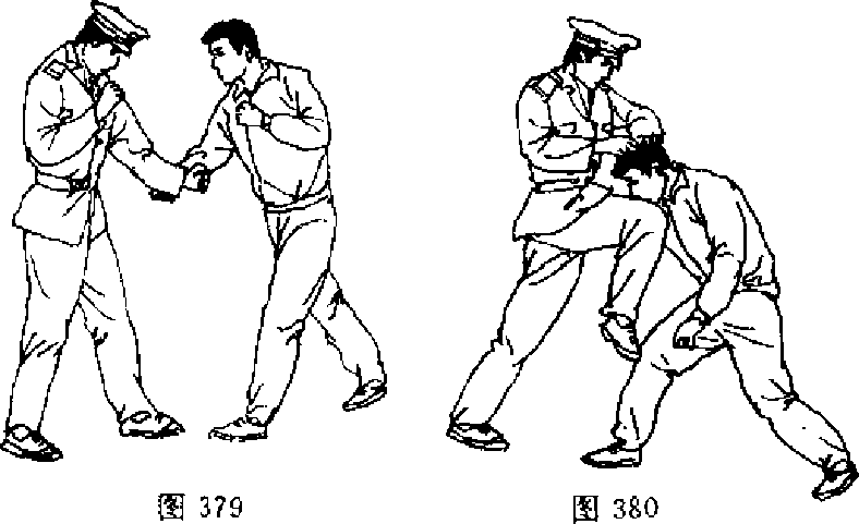 【动作说明】敌突然上步并用右上勾拳猛击我腹部,我 左手以小臂尺骨为力点向下猛砸其手腕(图379).接着,用右 手抢抓敌头发,并用力下拖,然后速用右膝猛力撞击敌面部 (图 3S0)&