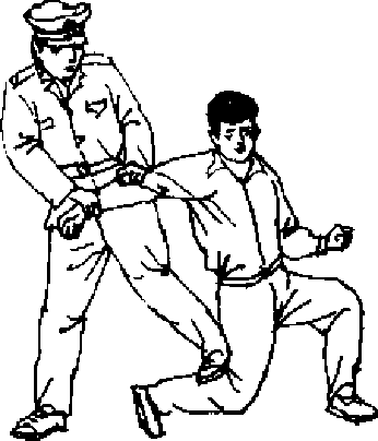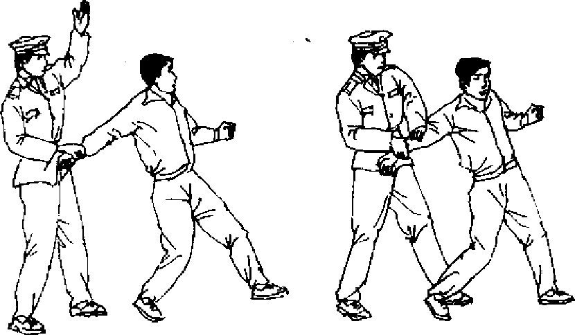 【动作说明】我由敌侧后迅速接近敌人,并用右手抓握 住敌右手腕(图381),左手成掌猛力拍击敌右肘关节(图 382).然后再用左脚向下猛力踹击敌右腿膝窝(图383),将敌