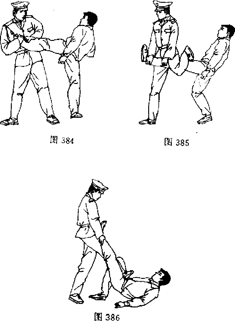 【动作说明】敌左拳虚晃我面部,突然用左腿向我中盘 踹来,我速用双手截抱住敌左小腿(图384),然后,起左腿,屈 膝上抬,用左小腿下压敌左腿膝关节(图385),敌倒地后,再 速起右脚下踩敌挡部(图386)。