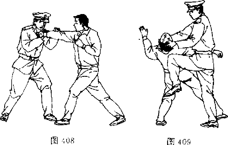【动作说明】 敌我对峙口敌突然向前进步,并用右直拳向 我胸部击来,我速向左前上步闪身,并同时用右手挡抓敌右 腕,然后用左手句下拍击敌右肘关节(图408).接着,我右脚 向前垫步,左手顺着敌右臂向左下抹按敌头,同时提左膝撞击 敌后脑(图409),