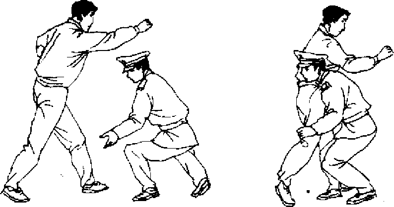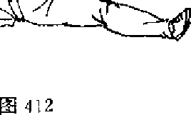 摔打组合搏杀法,是在散打快捧法的基础上,兼容各种打 法而克敌制胜的搏杀技术’其特点是摔中有打,打中有摔,摔 打兼施,组合连杀。(―)抱腿捽接跪裆夷耳【动作说明】敌我对峙■当敌向前进步,并用右摆拳向我 头部击打时,我迅速下豳闪防(图410),然后,速用两手抱住 敌后膝窝,以后拉和肩顶敌腹的合力将敌摔倒(图411)a敌倒 地后,我迅速上步踏臂,右膝撞裆,左手卡喉,右拳贯耳制敌 (图 412)O图妇0 图411