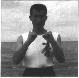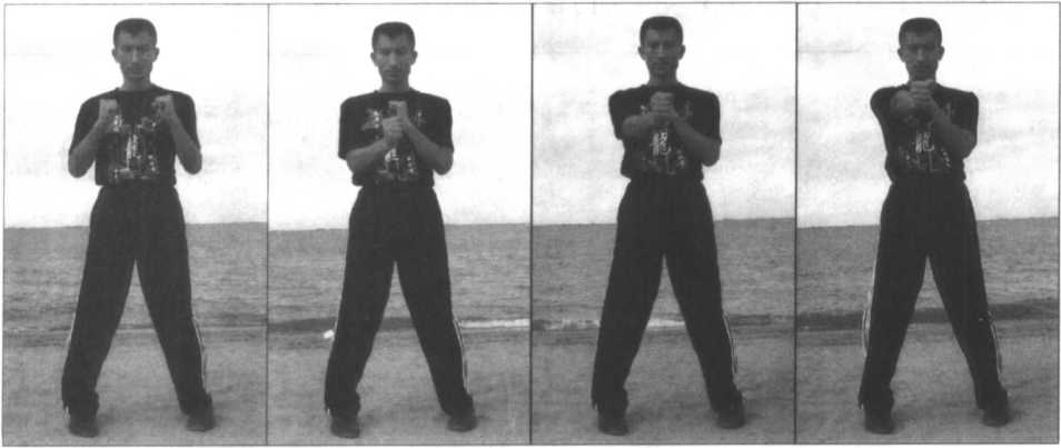 由正身(面向前方)的“摆桩”开始,双拳置于 胸前(图1-52);