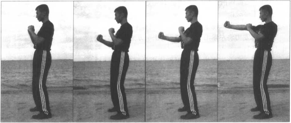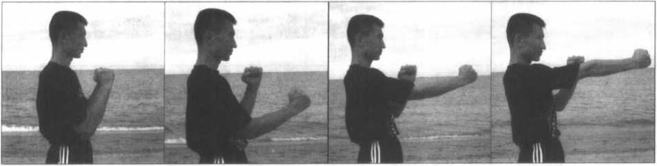 (图1-44、45、46、47)为右"曰字冲拳”的侧面示范。从图中可以看出在打拳 的过程中身体是不可晃动的,以保证“寸劲拳”特有的短距离爆炸劲力的有效发挥。