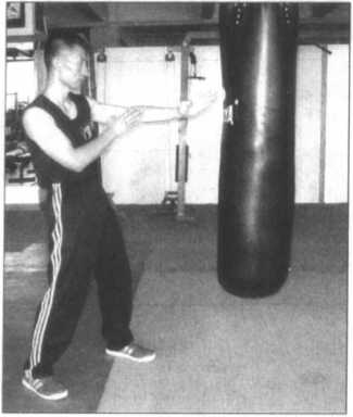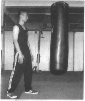 面对沙包站好,可以两脚左右分开站立,也可两脚 前后分开站立,双手自然下垂,准备随时发起攻击,上 体保持正直,目视正前方之沙包,并吸气(图3-42),