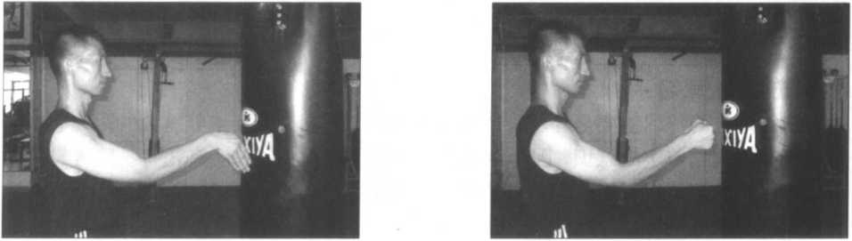 (图3-46、47、48、49)为右寸劲拳击打沙包时的近距离示范,仍须呼气并放松 (有弹性的)将左拳打出,要“快打快收二