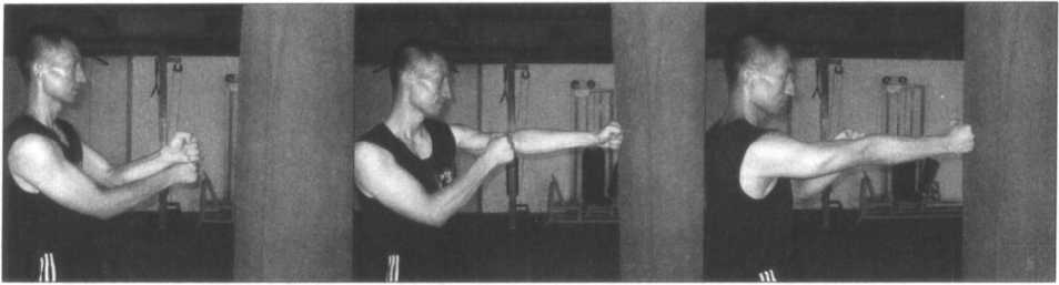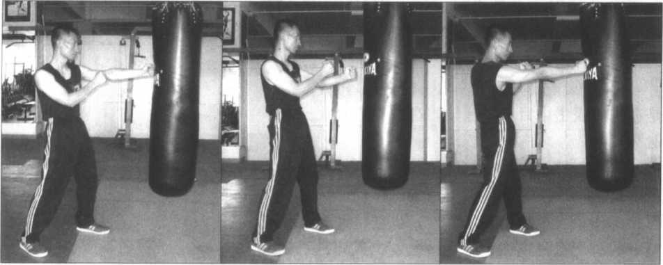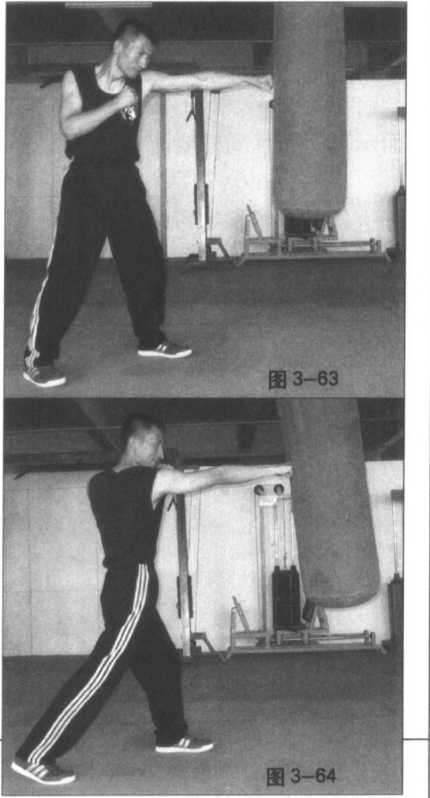 图 3-60 图 3-61 图 3-62图 3-60 图 3-61 图 3-62(图3-63、64)为以普通拳法击打沙 包时的示范,这种打法虽不符合寸劲拳的 技术要求,但对增强拳面硬度及发展纵深 性攻击力是极为有用的,所以可作为附加 的训练内容进行训练。