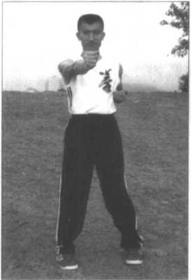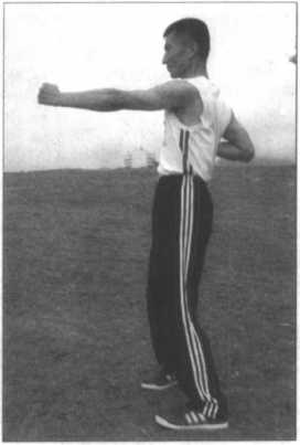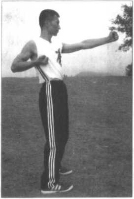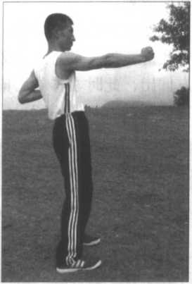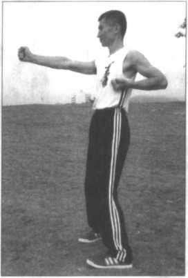 (图4-2)为静止举拳练习的侧面示范,右手臂是始终放于体前“中线”上的。