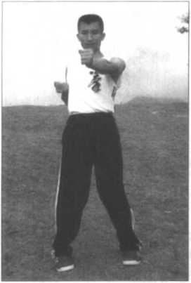 两脚左右分开站立,上体保持正直,左手放于腰部,右手握拳向正前方伸出,此 时右拳拳心向内而呈“立拳”,目视正前方(图4-1);