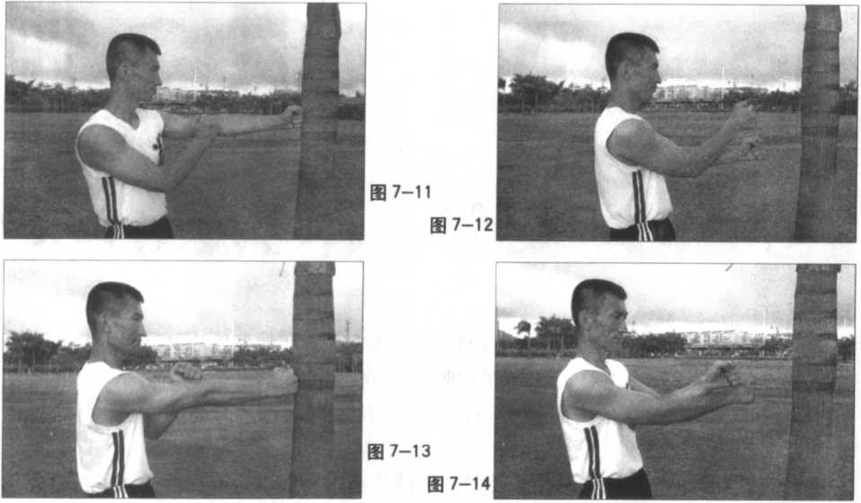 右拳向正前方放松地打出并打至臂 直状态,使右拳准确、有力的击中了正 前方的树木(图7-17)。