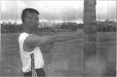 面对树木两脚左右分开站立,也可两脚前后分开站立,双手向前伸出摆桩,准备 随时发起攻击(图7-9),