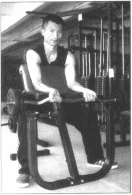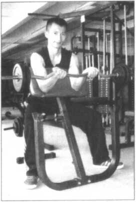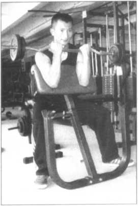 练习时两脚分开坐在训练凳上,两手手心向前(向上)握牢杠铃(图7-27),