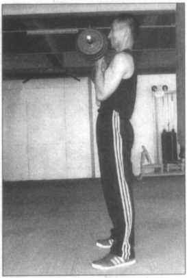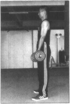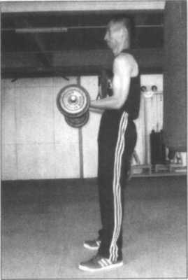 (图7-33、34、35)为由站立的状态进行直立杠铃弯举练习时的侧面示范。