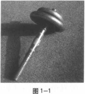 主要用来锻炼前臂肌力与重点体会“寸拳”发力。先找一根直径约2厘米的铁棍,以及一块重2公斤左右 的铁片或哑铃片,如果此时找不到铁棍时,较长的哑铃杆 也可以用。在铁棍的上1/4处焊接一个横的卡桦,使哑铃 片或铁片放上去后不至于掉下来。其实即使找不到铁棍时, 现成的哑铃杆上面已有凸出的部分而不会使哑铃片掉下来 (图1-1)。这样,用手握牢铁棍的中间部位,在用短促的“寸 劲”向前迅猛出击时便会产生“胱当”地撞击声,清脆而使 人振奋。不过,刚开始练习时器械不可太重,以免影响动作 的速度及爆炸力的发挥。