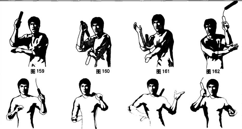 2 ?若右手做内挑后,左手伸至左侧背后接白棍换手,称为异棍背后换手(图163 ~ 166)。
