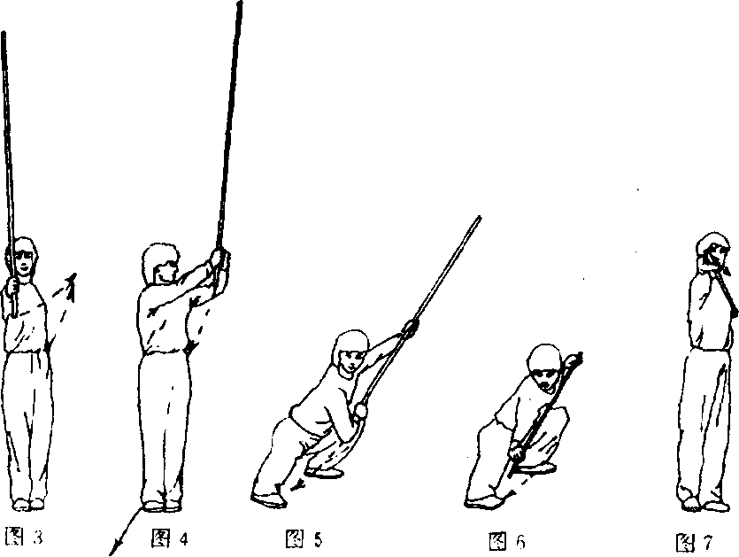 ③重心移至右腿,右腿直立,左脚跟向右脚内侧并靠成丁字 步;同时,右手持棍上摆至身体右侧,左手向棍稍方向滑握;目 视棍把(图7)。