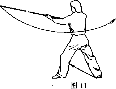 ③身体左后转,双手扫棍随转体向左平抡一周;目视棍梢 (图 11)0