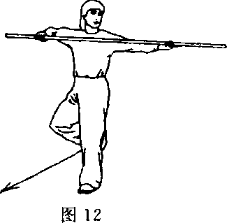 ④身体继续左后转,左脚外展,左腿直立支撑体重,右脚上 提贴扣左膝窝;同时,左手向棍梢方向滑握,使棍随转体向左侧 平摆;目视棍梢(图12)。