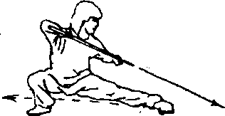 ⑤右脚向右侧落步,右腿屈膝 全蹲,左腿伸直成左仆步;同时, 上体稍左转,右臂屈肘,左臂伸直, 两手抱棍于胸前;目视左侧(图 13)c
