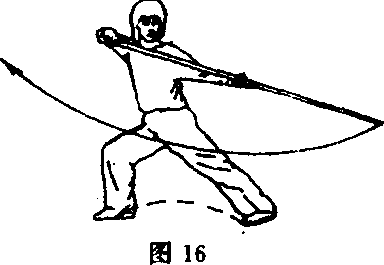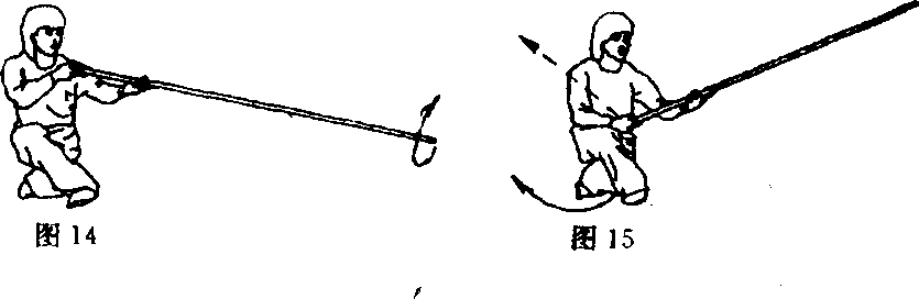 ②右手持棍向左、向下绞把,左手托棍使棍梢向右、向上、 向左绞棍,力达棍梢;目视棍梢(图15)。