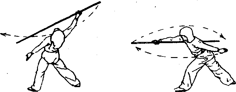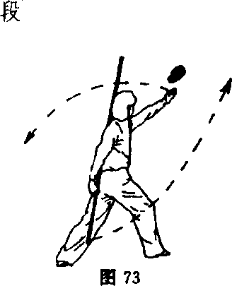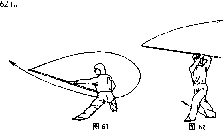 身体稍直起成横裆步;同时,左手向棍梢方向滑握,以左手 为支点,右手握把下压使棍梢崩起,力达棍梢;目视棍梢(图 61)o