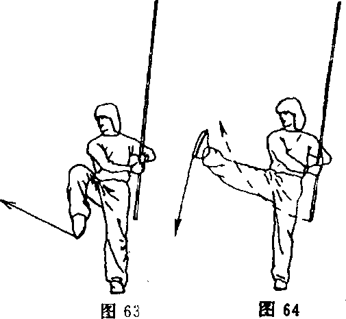 ②左腿直立,右腿屈膝提起;同时,双手持棍使棍梢向上摆 动,棍身立于身体左侧;目视右侧(图63)。