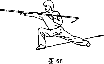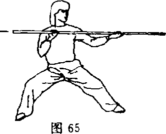 ②重心右移成右弓步;同时,双手持棍向右侧戳击,力达把 端,右臂伸直,左臂屈肘于胸前;目视棍把(图66)。