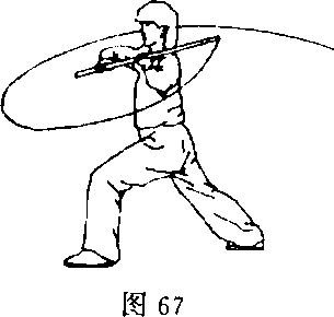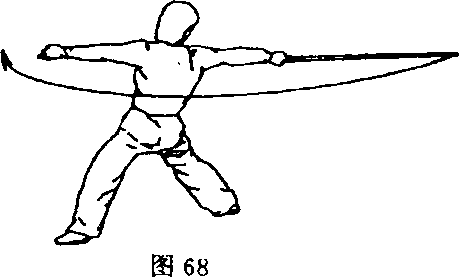 ②身体继续右转,重心移至两腿之间;同时,左手离棍,右 臂伸直,右手持棍向右平扫一周;目视棍梢(图68)。