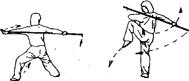 身体稍起时,右手略向前推,两手相触,成横裆步时,身体 微右转,左手直臂持棍,右手用力下压,使棍梢向上崩弹、颤 抖。