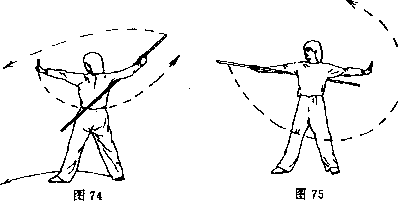 ④右手持棍使棍把继续向下经腿前向左、向上成立圆舞花, 左手在胸前接握棍身,两手虎口相对(图76)。