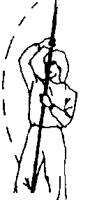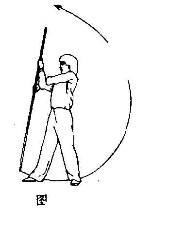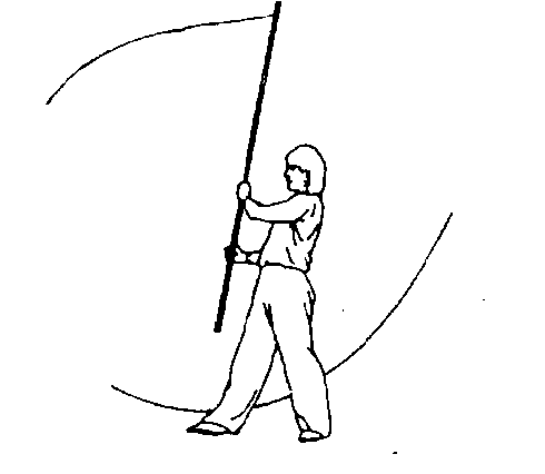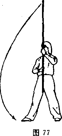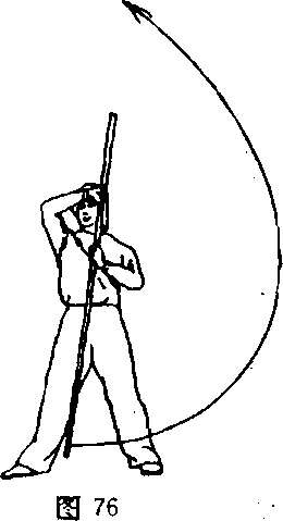 ⑤右手持棍使棍把下拨,左手换把,虎口朝上握棍上拨使棍 梢向左、向上舞花(图77)。,
