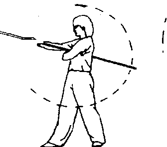 ②身体左转,重心移至两腿 之间;同时,左掌经上向左绕摆, 右手持棍使棍把向上绕摆;目视