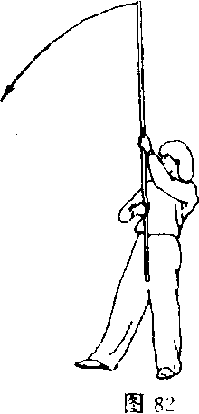 ①身体稍右转;双手持棍使棍把经前向下摆动,左手换把握 棍,虎口朝棍梢(图82)。