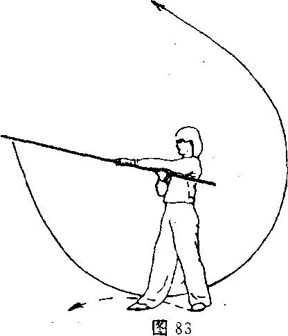 ②身体稍右转;同时,双手持棍,左手下拨使棍梢向前下摆 (图 83)。