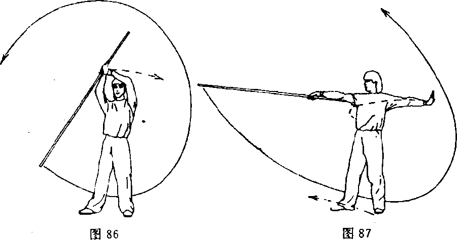⑥左手离棍,右手持棍转腕棍梢向下经身后向上、向前抡 摆;目视棍梢(图87)。