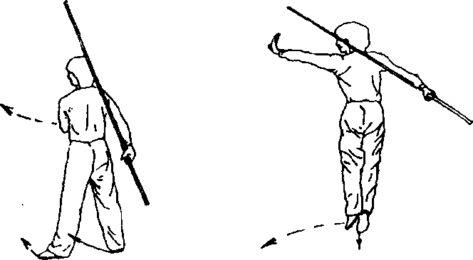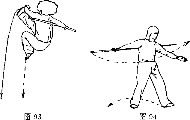 ?身体向左上方拧转,右腿蹬地跳起,左腿向左上方摆起; 同时,左手随转体向左上方抡摆,右手持棍使棍把向下经体前向 上抡摆(图92)。