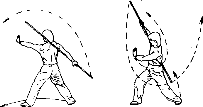 ⑤身体稍右转;双手持棍绞拨使棍梢经上向前、向下成立圆