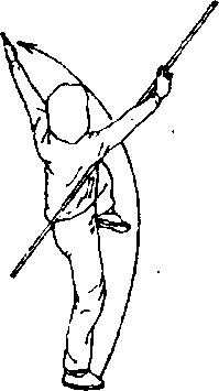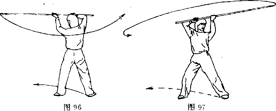 ③身体继续左后转,右脚向前上步;同时,,两手持棍向左平 摆(图97)。