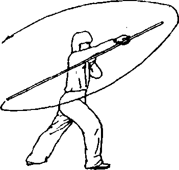 ②身体继续左转,重心左移;同时,左手换把,虎口朝棍 梢,两手持棍向左平绕一周(图96)。