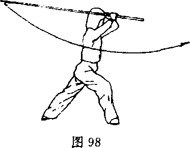 ④身体继续左转,左脚向 左后撤步;同时左手滑至右手 前,两手持棍随转体向左平抡 (图 98)。