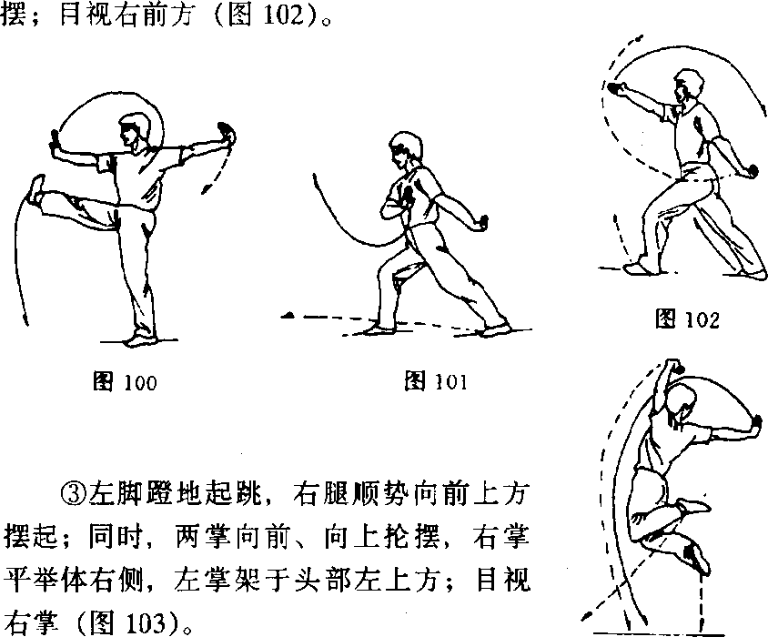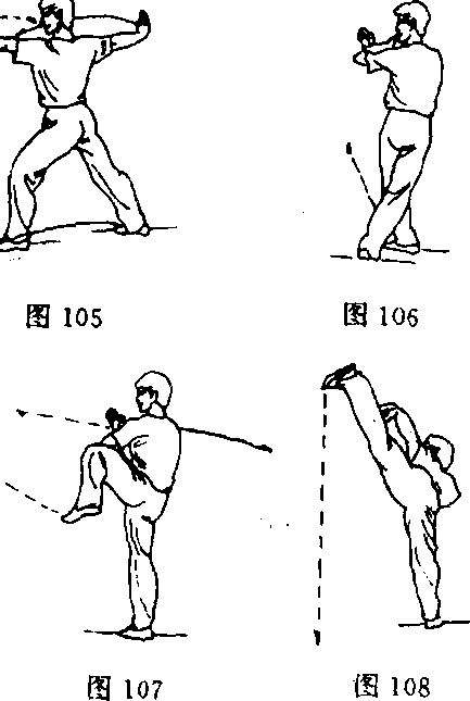 ③右腿独立支撑, 左腿屈膝向上提起(图 107) o