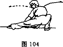 右、左脚先后落地成仆步;同时,两掌在左腿内侧拍击地 面;目视左掌(图104)。