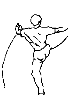 ①弧行步击响里合腿完成后,身体左转的力量不要太大,因 为在前面有弧行步,不必担心身体左转不够度数。同时,里合腿 的扇面摆动和击响点尽可能接近头部上方,上体不要前俯,以免 影响右腿的上摆。