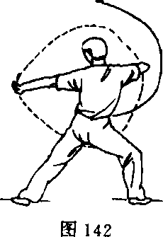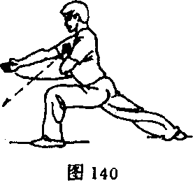 右掌直腕下拍快速有力,力达掌心, 分开,防止弓腰凸臀;动作不停顿。 ft fl.图 137、 图 138 上体前俯时,两膝可稍图139