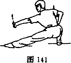 ②重心后移,右腿屈膝全蹲,左腿伸直成左仆步;同时,右 掌握拳屈肘收抱于腰右侧,拳心向上,左掌向左下方切掌,掌心 向下;目视左掌(图141)。