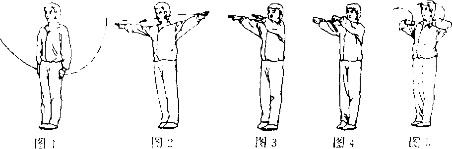 ②两掌握拳,两臂屈肘,两拳收于胸前,拳面相对,拳心朝 下;目视前方(图4、5)o